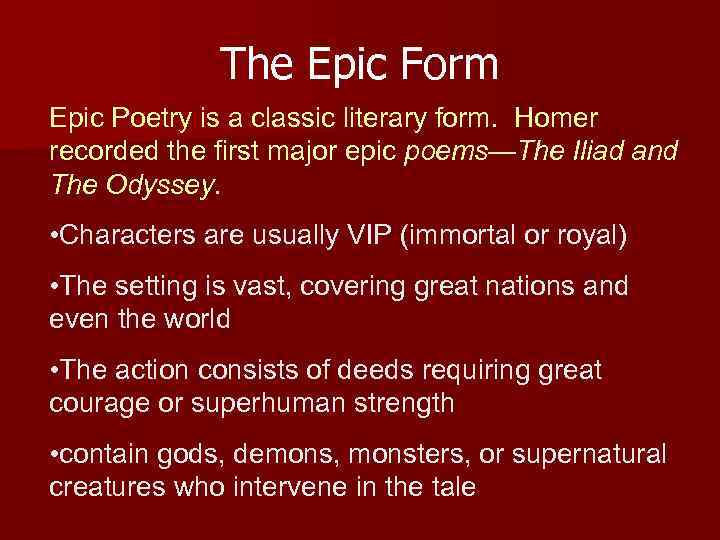 The Epic Form Epic Poetry is a classic literary form. Homer recorded the first major epic poems—The Iliad and The Odyssey. • Characters are usually VIP (immortal or royal) • The setting is vast, covering great nations and even the world • The action consists of deeds requiring great courage or superhuman strength • contain gods, demons, monsters, or supernatural creatures who intervene in the tale