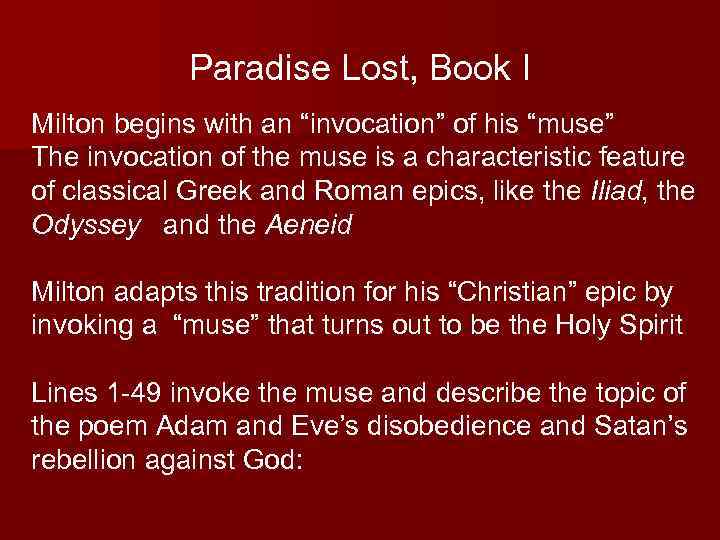 Paradise Lost, Book I Milton begins with an “invocation” of his “muse” The invocation of the muse is a characteristic feature of classical Greek and Roman epics, like the Iliad, the Odyssey and the Aeneid Milton adapts this tradition for his “Christian” epic by invoking a “muse” that turns out to be the Holy Spirit Lines 1 -49 invoke the muse and describe the topic of the poem Adam and Eve’s disobedience and Satan’s rebellion against God: