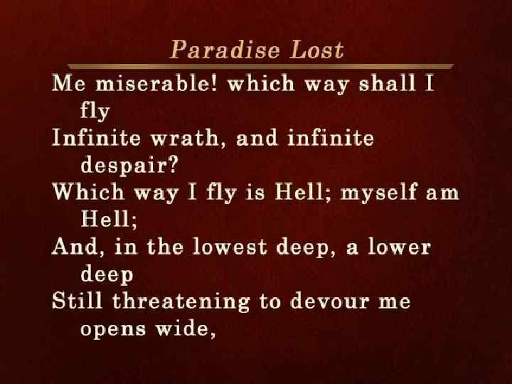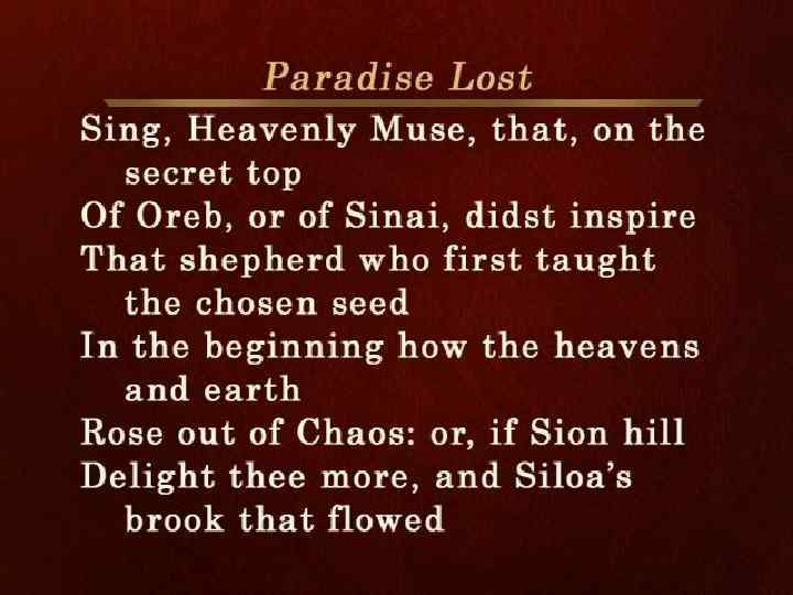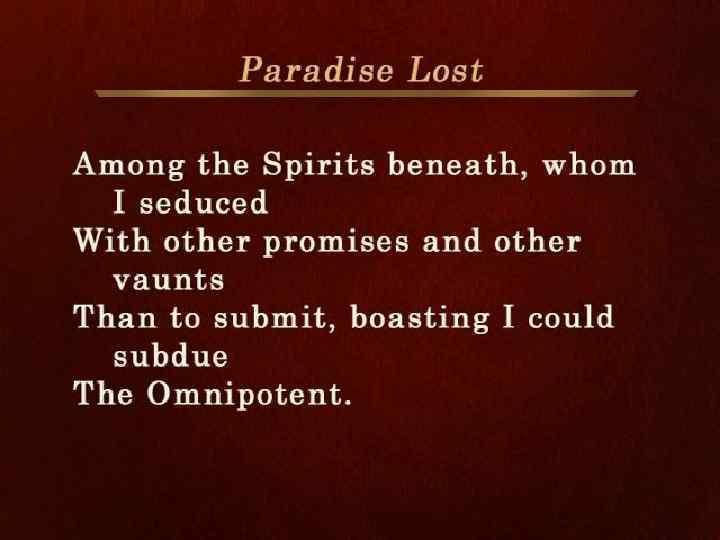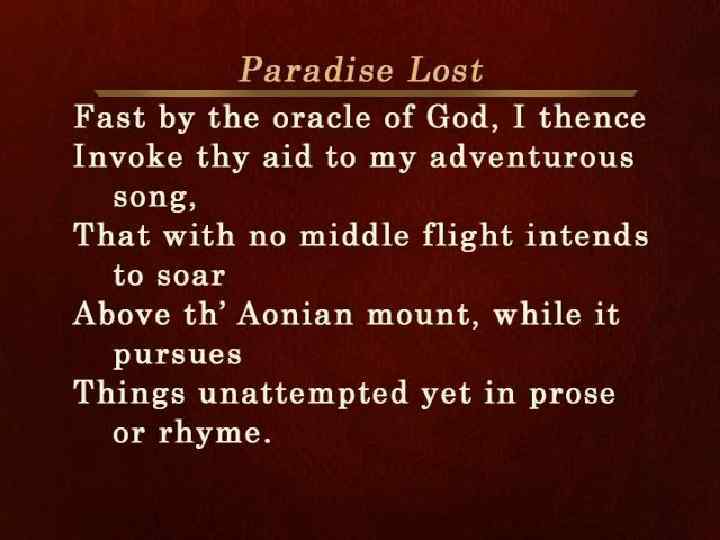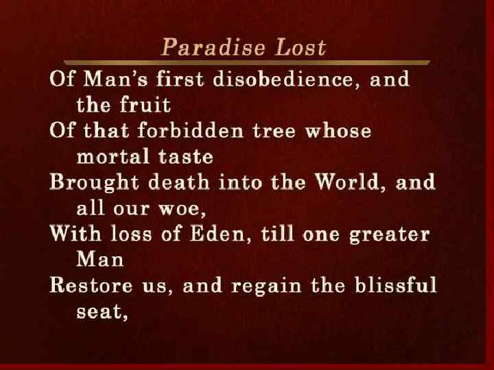 The theme n The origin of evil itself. n Milton believed, evil is embedded in man’s nature. n The subject of the poem – ‘of man’s first disobedience’ & the resulting loss of paradise.
