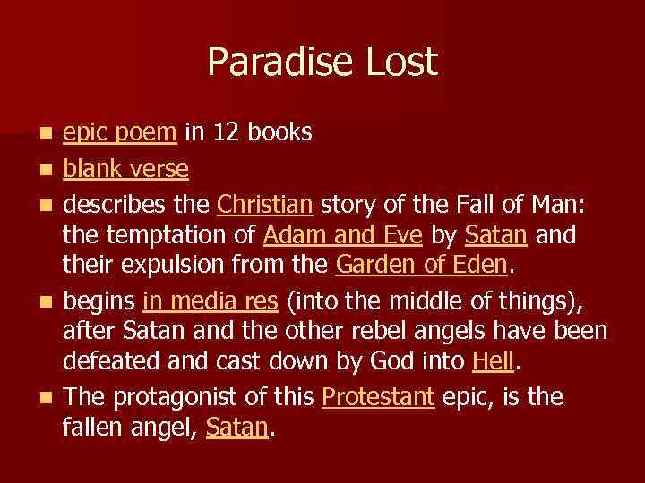Paradise Lost n n n epic poem in 12 books blank verse describes the Christian story of the Fall of Man: the temptation of Adam and Eve by Satan and their expulsion from the Garden of Eden. begins in media res (into the middle of things), after Satan and the other rebel angels have been defeated and cast down by God into Hell. The protagonist of this Protestant epic, is the fallen angel, Satan.