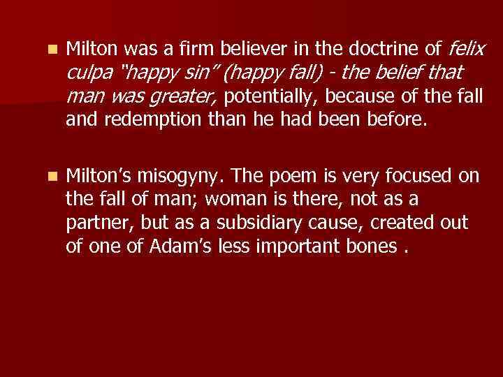 n Milton was a firm believer in the doctrine of felix culpa “happy sin” (happy fall) - the belief that man was greater, potentially, because of the fall and redemption than he had been before. n Milton’s misogyny. The poem is very focused on the fall of man; woman is there, not as a partner, but as a subsidiary cause, created out of one of Adam’s less important bones.