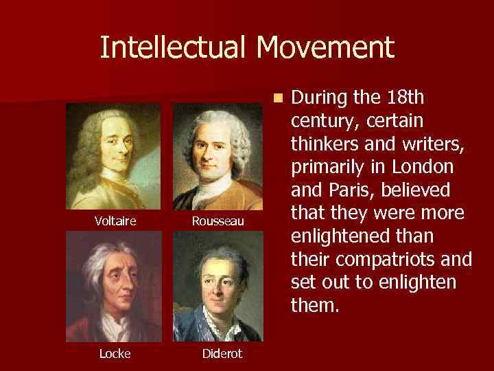 Intellectual Movement n Voltaire Locke Rousseau Diderot During the 18 th century, certain thinkers and writers, primarily in London and Paris, believed that they were more enlightened than their compatriots and set out to enlighten them.