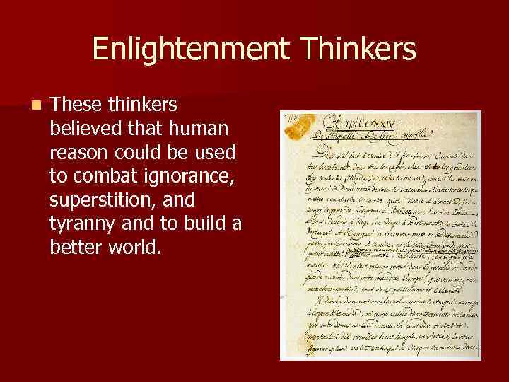 Enlightenment Thinkers n These thinkers believed that human reason could be used to combat ignorance, superstition, and tyranny and to build a better world.