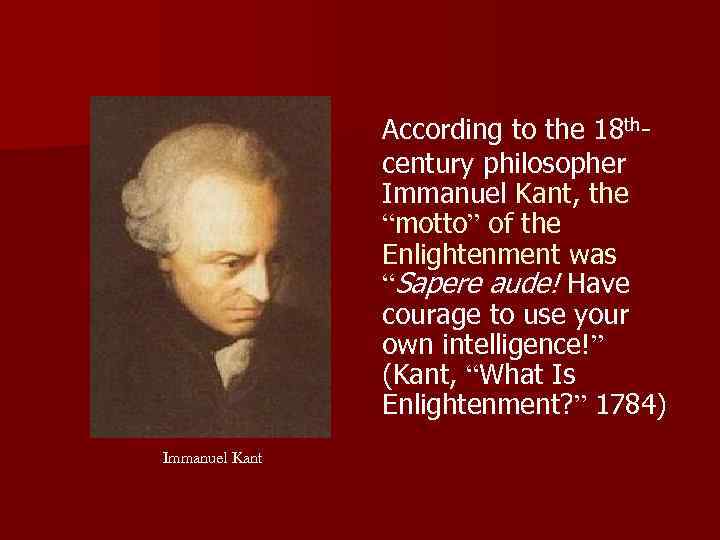 According to the 18 th- century philosopher Immanuel Kant, the “motto” of the Enlightenment was “Sapere aude! Have courage to use your own intelligence!” (Kant, “What Is Enlightenment? ” 1784) Immanuel Kant