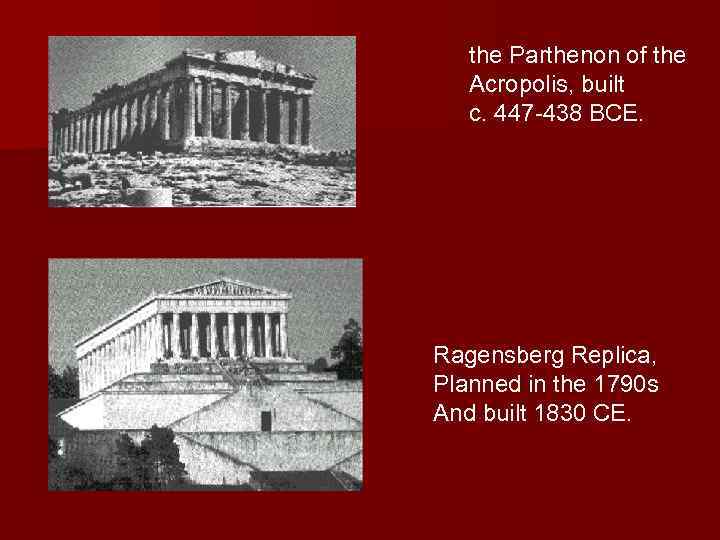 the Parthenon of the Acropolis, built c. 447 -438 BCE. Ragensberg Replica, Planned in the 1790 s And built 1830 CE.