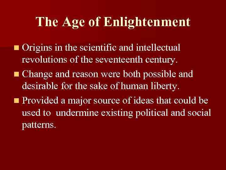 The Age of Enlightenment n Origins in the scientific and intellectual revolutions of the seventeenth century. n Change and reason were both possible and desirable for the sake of human liberty. n Provided a major source of ideas that could be used to undermine existing political and social patterns.