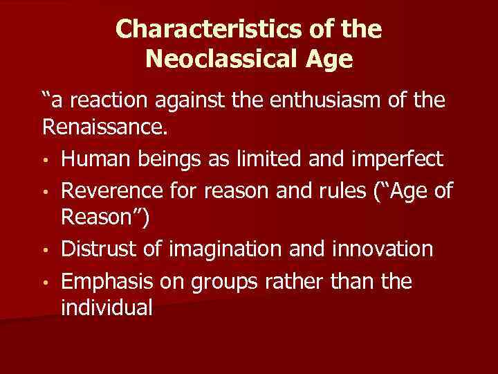 Characteristics of the Neoclassical Age “a reaction against the enthusiasm of the Renaissance. • Human beings as limited and imperfect • Reverence for reason and rules (“Age of Reason”) • Distrust of imagination and innovation • Emphasis on groups rather than the individual