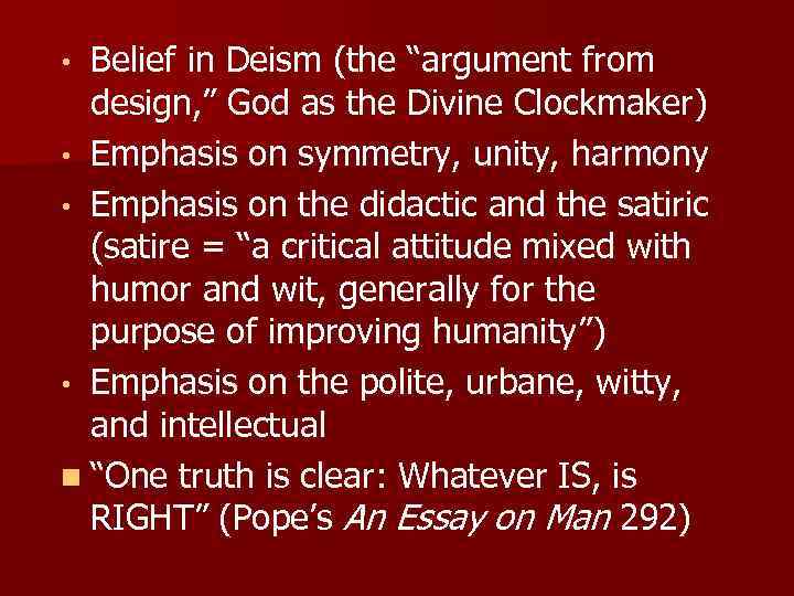 Belief in Deism (the “argument from design, ” God as the Divine Clockmaker) • Emphasis on symmetry, unity, harmony • Emphasis on the didactic and the satiric (satire = “a critical attitude mixed with humor and wit, generally for the purpose of improving humanity”) • Emphasis on the polite, urbane, witty, and intellectual n “One truth is clear: Whatever IS, is RIGHT” (Pope’s An Essay on Man 292) •