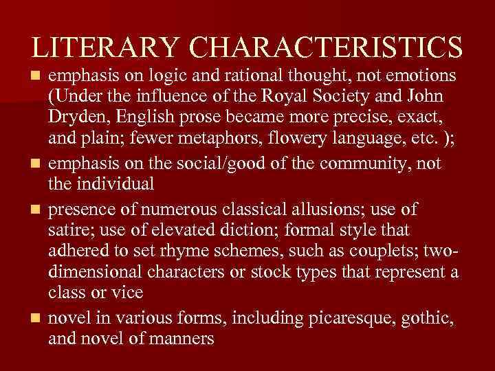 LITERARY CHARACTERISTICS emphasis on logic and rational thought, not emotions (Under the influence of the Royal Society and John Dryden, English prose became more precise, exact, and plain; fewer metaphors, flowery language, etc. ); n emphasis on the social/good of the community, not the individual n presence of numerous classical allusions; use of satire; use of elevated diction; formal style that adhered to set rhyme schemes, such as couplets; twodimensional characters or stock types that represent a class or vice n novel in various forms, including picaresque, gothic, and novel of manners n