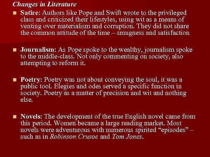 Changes in Literature n Satire: Authors like Pope and Swift wrote to the privileged class and criticized their lifestyles, using wit as a means of venting over materialism and corruption. They did not share the common attitude of the time – smugness and satisfaction n Journalism: As Pope spoke to the wealthy, journalism spoke to the middle-class. Not only commenting on society, also attempting to reform it. n Poetry: Poetry was not about conveying the soul, it was a public tool. Elegies and odes served a specific function in society. Poetry as a matter of precision and wit and nothing else. n Novels: The development of the true English novel came from this period. Women became a large reading market. Most novels were adventurous with numerous spirited “episodes” – such as in Robinson Crusoe and Tom Jones.
