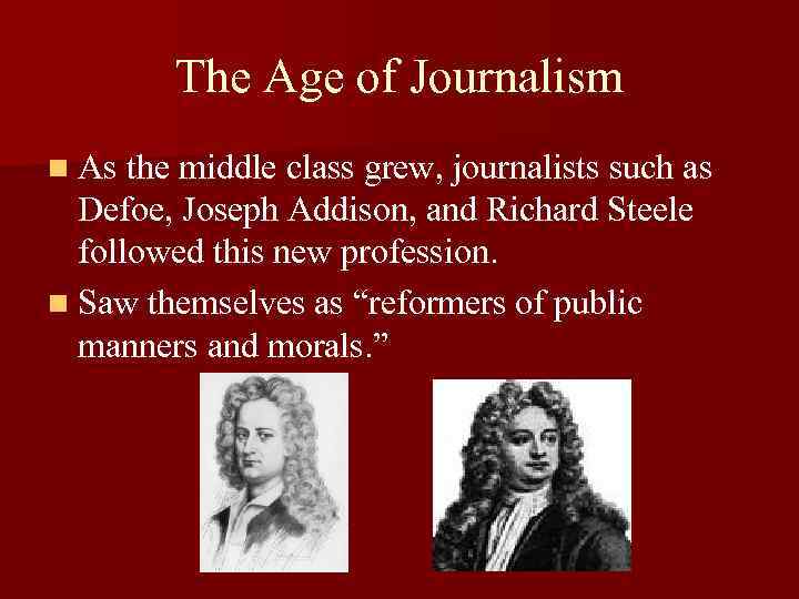 The Age of Journalism n As the middle class grew, journalists such as Defoe, Joseph Addison, and Richard Steele followed this new profession. n Saw themselves as “reformers of public manners and morals. ”