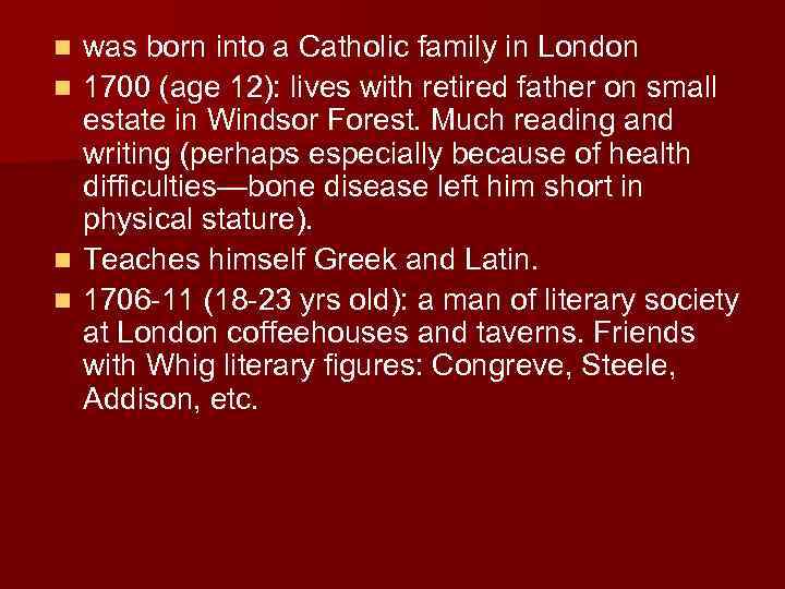 n n was born into a Catholic family in London 1700 (age 12): lives with retired father on small estate in Windsor Forest. Much reading and writing (perhaps especially because of health difficulties—bone disease left him short in physical stature). Teaches himself Greek and Latin. 1706 -11 (18 -23 yrs old): a man of literary society at London coffeehouses and taverns. Friends with Whig literary figures: Congreve, Steele, Addison, etc.