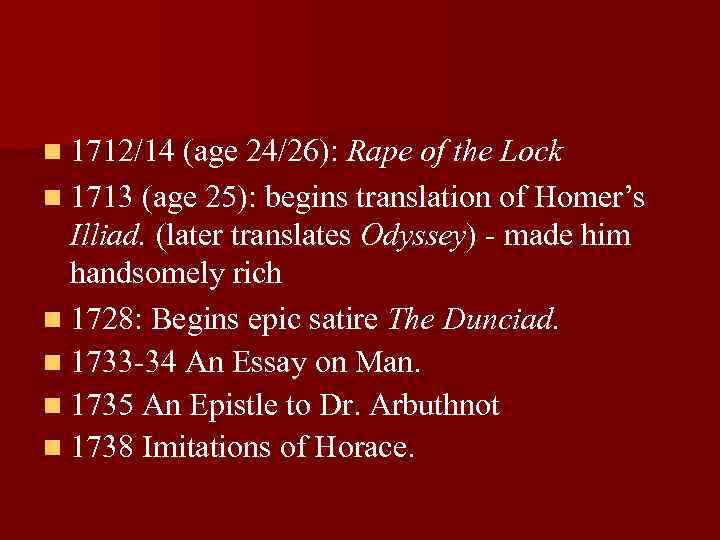 n 1712/14 (age 24/26): Rape of the Lock n 1713 (age 25): begins translation of Homer’s Illiad. (later translates Odyssey) - made him handsomely rich n 1728: Begins epic satire The Dunciad. n 1733 -34 An Essay on Man. n 1735 An Epistle to Dr. Arbuthnot n 1738 Imitations of Horace.