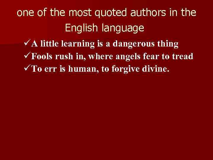 one of the most quoted authors in the English language üA little learning is a dangerous thing üFools rush in, where angels fear to tread üTo err is human, to forgive divine.