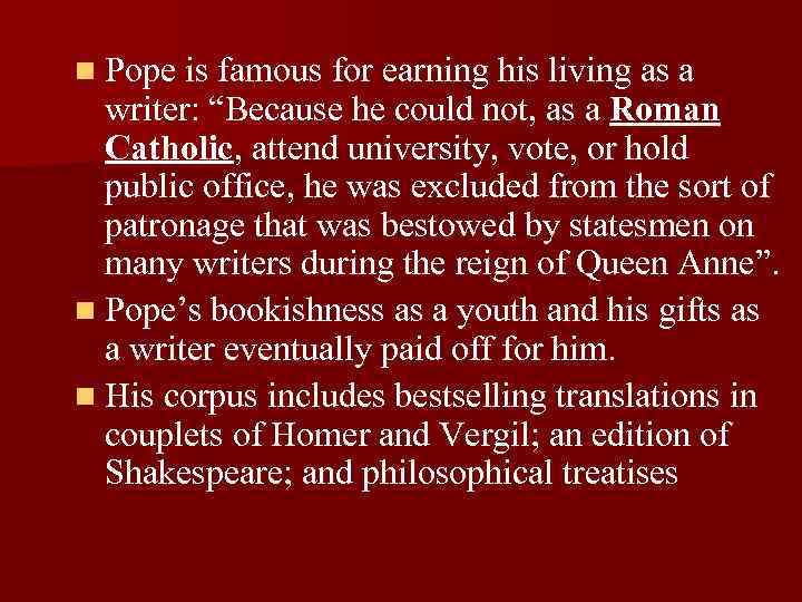 n Pope is famous for earning his living as a writer: “Because he could not, as a Roman Catholic, attend university, vote, or hold public office, he was excluded from the sort of patronage that was bestowed by statesmen on many writers during the reign of Queen Anne”. n Pope’s bookishness as a youth and his gifts as a writer eventually paid off for him. n His corpus includes bestselling translations in couplets of Homer and Vergil; an edition of Shakespeare; and philosophical treatises