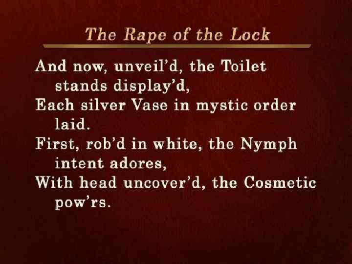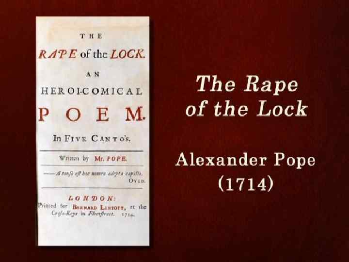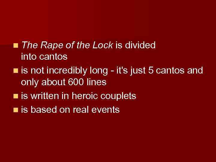 n The Rape of the Lock is divided into cantos n is not incredibly long - it's just 5 cantos and only about 600 lines n is written in heroic couplets n is based on real events