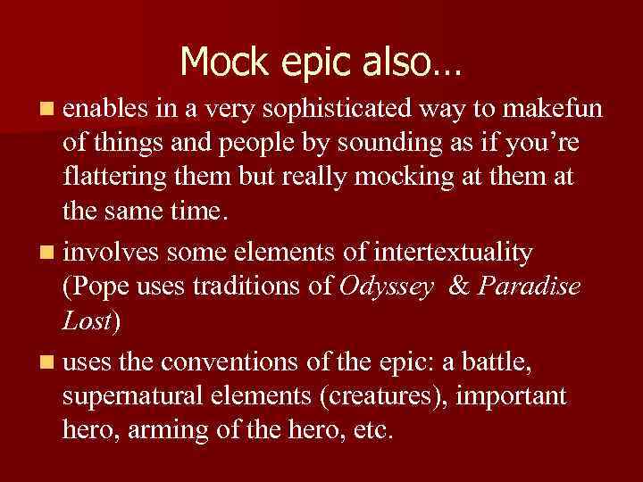 Mock epic also… n enables in a very sophisticated way to makefun of things and people by sounding as if you’re flattering them but really mocking at them at the same time. n involves some elements of intertextuality (Pope uses traditions of Odyssey & Paradise Lost) n uses the conventions of the epic: a battle, supernatural elements (creatures), important hero, arming of the hero, etc.