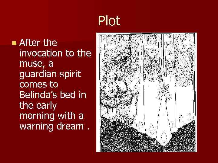 Plot n After the invocation to the muse, a guardian spirit comes to Belinda’s bed in the early morning with a warning dream.