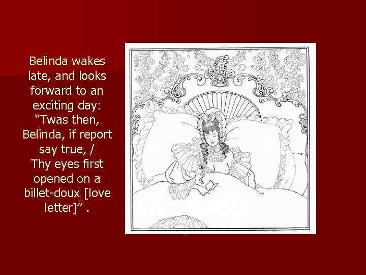 Belinda wakes late, and looks forward to an exciting day: “Twas then, Belinda, if report say true, / Thy eyes first opened on a billet-doux [love letter]”.