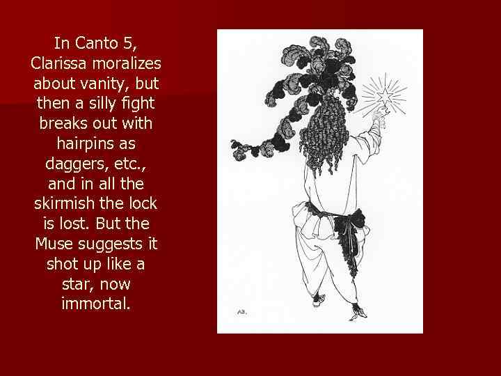 In Canto 5, Clarissa moralizes about vanity, but then a silly fight breaks out with hairpins as daggers, etc. , and in all the skirmish the lock is lost. But the Muse suggests it shot up like a star, now immortal.