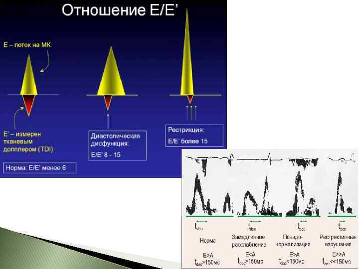 Катетеризация сердца: рестриктивный тип диастолической дисфункции в виде «квадратного корня» . ДЛА часто > 50 мм. рт. ст.
