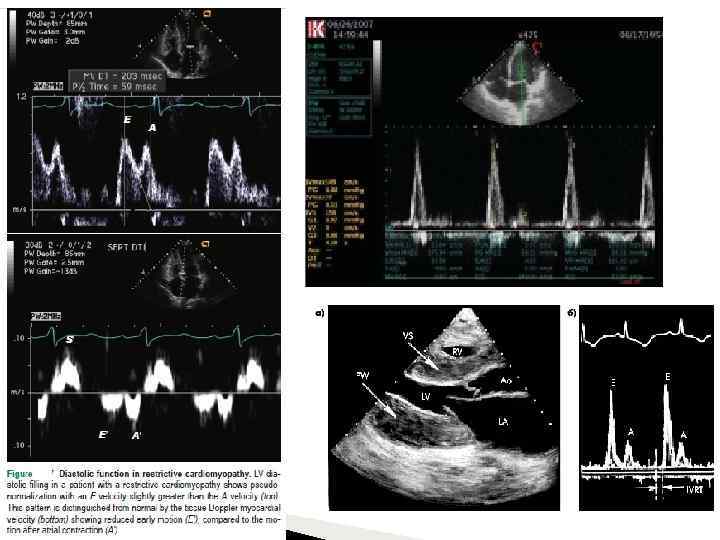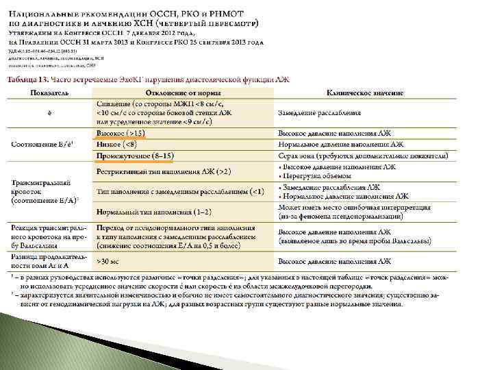 RH ОГК: нормальные/незначительно увеличенные размеры сердца, признаки застоя в легких. ЭКГ: неспецифические изменения. Возможна ГЛЖ, неспецифические изменения ST и T, нарушения внутрижелудочковой проводимости, аритмии. Сниженный вольтаж. Эхо. КГ: практически нормальная систолическая функция ЛЖ в сочетании с резким нарушением диастолической функции: ◦ рестриктивный тип диастолического наполнения при допплеровской Эхо. КГ ◦ увеличение предсердий и признаками повышения давления в ЛА. В последствии может развиться систолическая дисфункция. Желудочки не дилатированы. Толщина стенок увеличивается при амилоидозе и б. накопления. МРТ и ЭМБ – наиболее чувствительно
