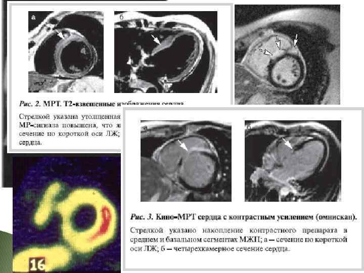 Саркоидоз сердца Один из жизнеугрожающих вариантов проявления заболевания, встречается у 2 -18% больных саркоидозом. Течение саркоидоза сердца характеризуется определенной автономностью, не совпадая с фазами процесса в лёгких и внутригрудных лимфатических узлах. Различают: ◦ Фульминантные, быстропрогрессирующие и медленнопрогрессирующие варианты кардиосаркоидоза ◦ ВСС, кардиогенный шок ◦ АВ-блок, поражение проводящей системы, злокачественные аритмии ◦ Инфарктоподобный, миокардитический вариант, кардиалгии, ◦ ХСН – cor pulmonale , ГЛЖ, утолщение миокарда, ДКМП, РКМП ◦ ЛГ Независимыми предикторами летальности являются ФК НК, КДО ЛЖ, наличие устойчивой ЖТ. Повышение тропонинов – очень редко. Обсуждается роль повышения NT-pro-BNP у пациентов с нормальной фракцией выброса. Повышение титра антител к миокарду без указания количественного диапазона. Частота выявления ЭКГ-патологии : 42% при микроскопическом типе и 77% - при обширной гранулёматозной инфильтрации. Для уточнения дигноза проводят: сцинтиграфию миокарда МРТ сердца с отсроченным контрастированием гадолинием ПЭТ.