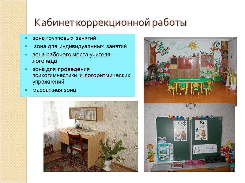 Кабинет коррекционной работы зона групповых занятий зона для индивидуальных занятий зона рабочего места учителя-логопеда зона для проведения психогимнастики и логоритмических упражнений массажная зона