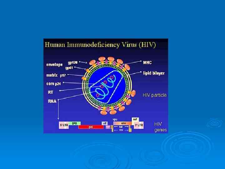 Геном ВИЧ Ø Ø Ø Ø Ø образуют две нити +РНК, соединённые вблизи их 5'терминалей; включает следующие гены: 1. Ген gag кодирует полипротеин, постсинтетически расщепляющийся на отдельные иммуногенные структурные белки (группоспецифичные Аг). 2. Ген pol кодирует синтез обратной транскриптазы (ревертазы). 3. Гены, локализованные вблизи соединения gag-pol, 4. Ген env кодирует гликопротеины оболочки. 5. Регуляторные гены а. Ген tat (трансактиватор транскрипции) б. Ген rev (регулятор экспрессии вирусных белков). Ген nef (отрицательный фактор экспрессии) в. Ген vif (фактор инфекционности вируса)