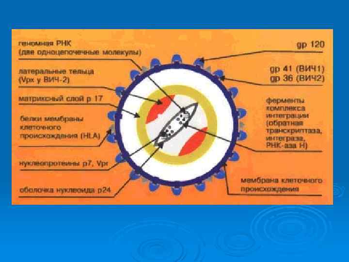Строение ВИЧ имеют сферическую форму, их размеры не превышают 100 -120 нм в диаметре. Ø Наружная оболочка образована двойным липидным слоем с гликопротеиновыми «шипами» . Ø Каждый содержит две субъединицы (gp 41 и gpl 20); первый белок пронизывает липидный слой насквозь. Ø Под оболочкой расположена сердцевина цилиндрической или конусовидной формы; её образуют белки р18 и р24. В сердцевине располагаются РНК, внутренние белки (р7 и р9) и обратная транскриптаза. Ø