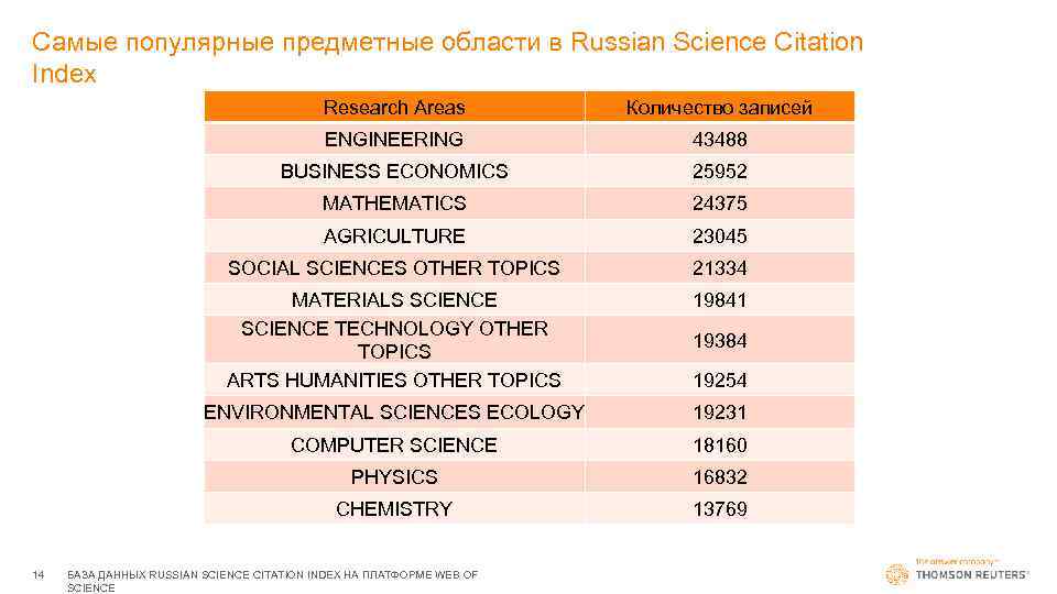 Самые популярные предметные области в Russian Science Citation Index Research Areas ENGINEERING 43488 BUSINESS ECONOMICS 25952 MATHEMATICS 24375 AGRICULTURE 23045 SOCIAL SCIENCES OTHER TOPICS 21334 MATERIALS SCIENCE TECHNOLOGY OTHER TOPICS ARTS HUMANITIES OTHER TOPICS 19841 ENVIRONMENTAL SCIENCES ECOLOGY 19231 COMPUTER SCIENCE 18160 PHYSICS 16832 CHEMISTRY 14 Количество записей 13769 БАЗА ДАННЫХ RUSSIAN SCIENCE CITATION INDEX НА ПЛАТФОРМЕ WEB OF SCIENCE 19384 19254