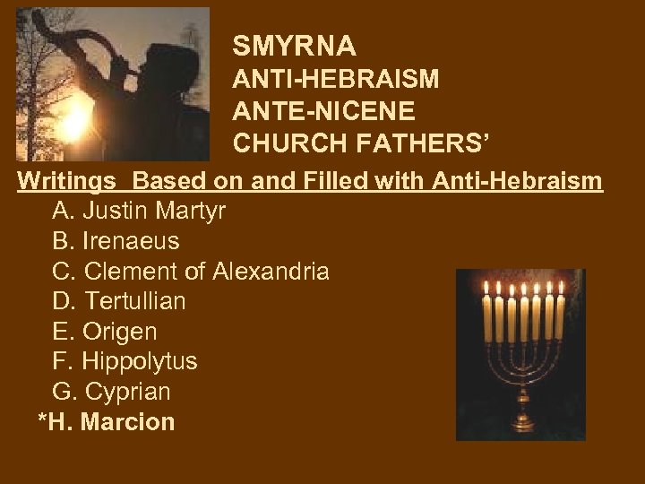 SMYRNA ANTI-HEBRAISM ANTE-NICENE CHURCH FATHERS’ Writings Based on and Filled with Anti-Hebraism A. Justin Martyr B. Irenaeus C. Clement of Alexandria D. Tertullian E. Origen F. Hippolytus G. Cyprian *H. Marcion