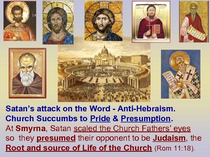 Satan’s attack on the Word - Anti-Hebraism. Church Succumbs to Pride & Presumption. At Smyrna, Satan scaled the Church Fathers’ eyes so they presumed their opponent to be Judaism, the Root and source of Life of the Church (Rom 11: 18).