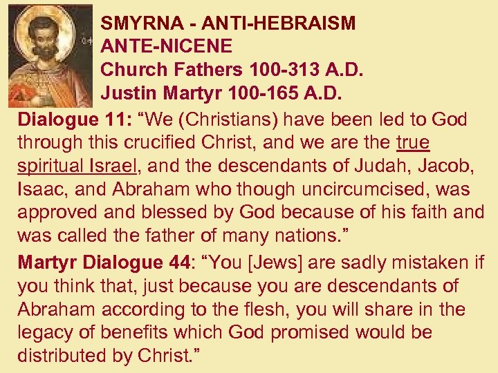 SMYRNA - ANTI-HEBRAISM ANTE-NICENE Church Fathers 100 -313 A. D. Justin Martyr 100 -165 A. D. Dialogue 11: “We (Christians) have been led to God through this crucified Christ, and we are the true spiritual Israel, and the descendants of Judah, Jacob, Isaac, and Abraham who though uncircumcised, was approved and blessed by God because of his faith and was called the father of many nations. ” Martyr Dialogue 44: “You [Jews] are sadly mistaken if you think that, just because you are descendants of Abraham according to the flesh, you will share in the legacy of benefits which God promised would be distributed by Christ. ”