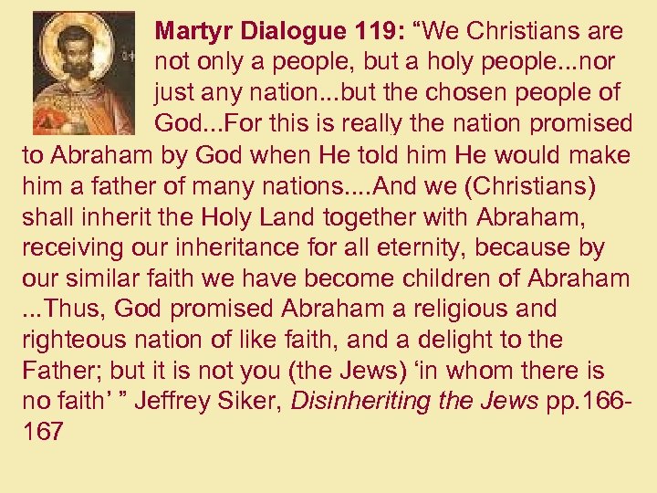 Martyr Dialogue 119: “We Christians are not only a people, but a holy people. . . nor just any nation. . . but the chosen people of God. . . For this is really the nation promised to Abraham by God when He told him He would make him a father of many nations. . And we (Christians) shall inherit the Holy Land together with Abraham, receiving our inheritance for all eternity, because by our similar faith we have become children of Abraham. . . Thus, God promised Abraham a religious and righteous nation of like faith, and a delight to the Father; but it is not you (the Jews) ‘in whom there is no faith’ ” Jeffrey Siker, Disinheriting the Jews pp. 166167