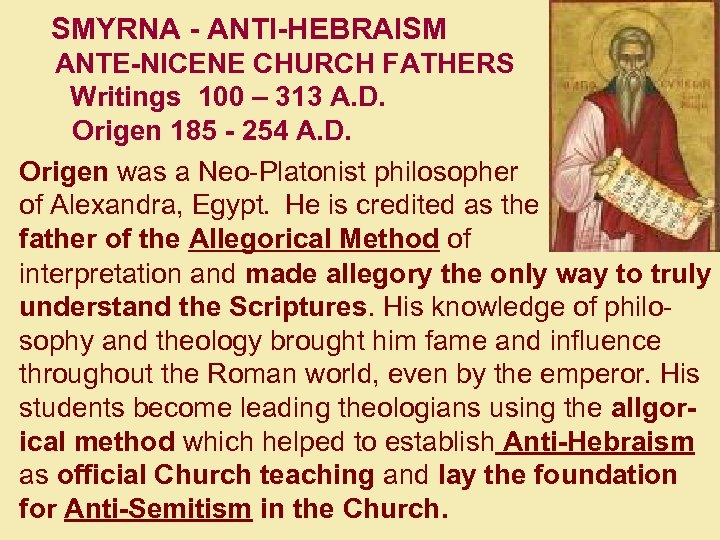 SMYRNA - ANTI-HEBRAISM ANTE-NICENE CHURCH FATHERS Writings 100 – 313 A. D. Origen 185 - 254 A. D. Origen was a Neo-Platonist philosopher of Alexandra, Egypt. He is credited as the father of the Allegorical Method of interpretation and made allegory the only way to truly understand the Scriptures. His knowledge of philosophy and theology brought him fame and influence throughout the Roman world, even by the emperor. His students become leading theologians using the allgorical method which helped to establish Anti-Hebraism as official Church teaching and lay the foundation for Anti-Semitism in the Church.