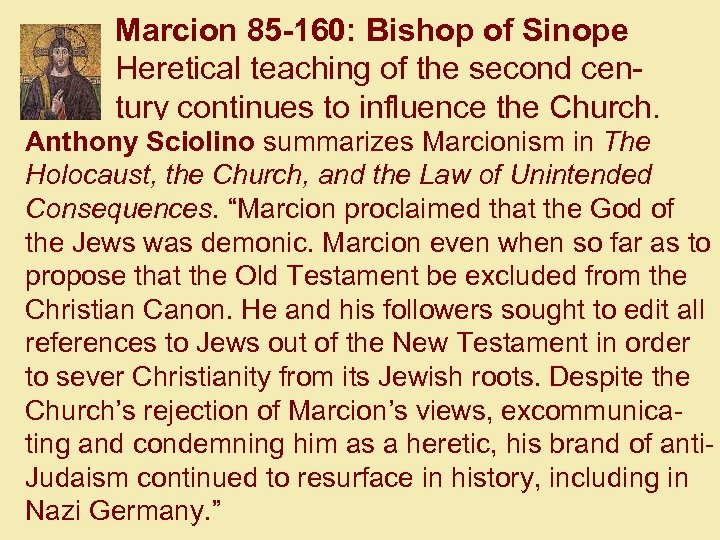 Marcion 85 -160: Bishop of Sinope Heretical teaching of the second century continues to influence the Church. Anthony Sciolino summarizes Marcionism in The Holocaust, the Church, and the Law of Unintended Consequences. “Marcion proclaimed that the God of the Jews was demonic. Marcion even when so far as to propose that the Old Testament be excluded from the Christian Canon. He and his followers sought to edit all references to Jews out of the New Testament in order to sever Christianity from its Jewish roots. Despite the Church’s rejection of Marcion’s views, excommunicating and condemning him as a heretic, his brand of anti. Judaism continued to resurface in history, including in Nazi Germany. ”
