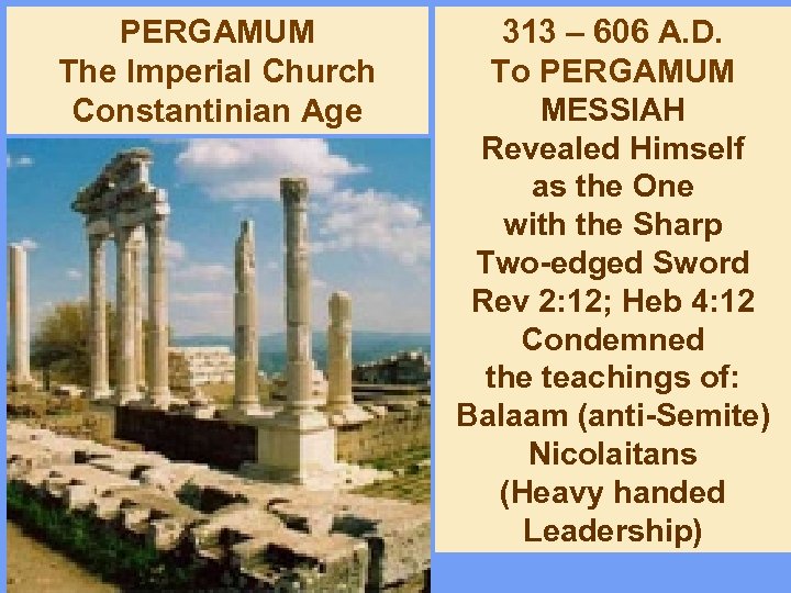 PERGAMUM The Imperial Church Constantinian Age 313 – 606 A. D. To PERGAMUM MESSIAH Revealed Himself as the One with the Sharp Two-edged Sword Rev 2: 12; Heb 4: 12 Condemned the teachings of: Balaam (anti-Semite) Nicolaitans (Heavy handed Leadership)