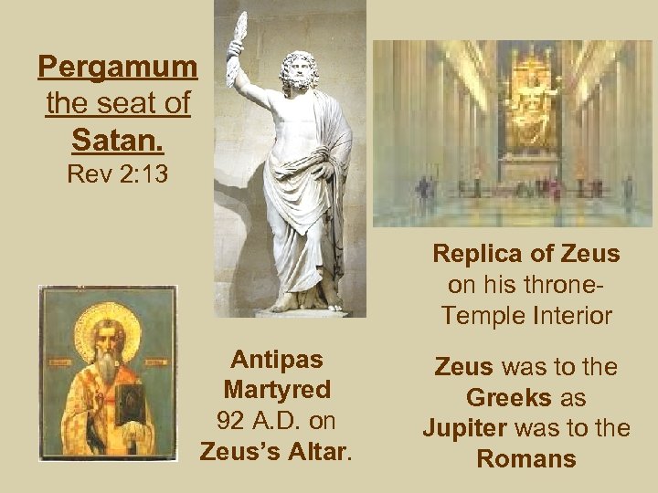 Pergamum the seat of Satan. Rev 2: 13 Replica of Zeus on his throne. Temple Interior Antipas Martyred 92 A. D. on Zeus’s Altar. Zeus was to the Greeks as Jupiter was to the Romans