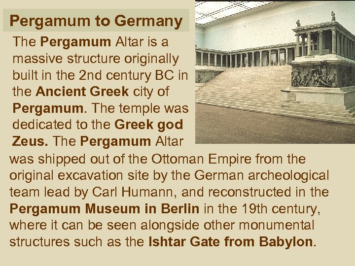 Pergamum to Germany The Pergamum Altar is a massive structure originally built in the 2 nd century BC in the Ancient Greek city of Pergamum. The temple was dedicated to the Greek god Zeus. The Pergamum Altar was shipped out of the Ottoman Empire from the original excavation site by the German archeological team lead by Carl Humann, and reconstructed in the Pergamum Museum in Berlin in the 19 th century, where it can be seen alongside other monumental structures such as the Ishtar Gate from Babylon.