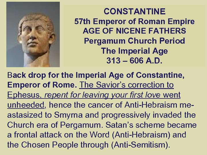 CONSTANTINE 57 th Emperor of Roman Empire AGE OF NICENE FATHERS Pergamum Church Period The Imperial Age 313 – 606 A. D. Back drop for the Imperial Age of Constantine, Emperor of Rome. The Savior’s correction to Ephesus, repent for leaving your first love went unheeded, hence the cancer of Anti-Hebraism meastasized to Smyrna and progressively invaded the Church era of Pergamum. Satan’s scheme became a frontal attack on the Word (Anti-Hebraism) and the Chosen People through (Anti-Semitism).