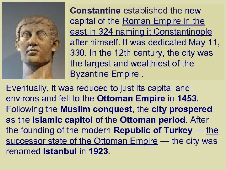 Constantine established the new capital of the Roman Empire in the east in 324 naming it Constantinople after himself. It was dedicated May 11, 330. In the 12 th century, the city was the largest and wealthiest of the Byzantine Empire. Eventually, it was reduced to just its capital and environs and fell to the Ottoman Empire in 1453. Following the Muslim conquest, the city prospered as the Islamic capitol of the Ottoman period. After the founding of the modern Republic of Turkey — the successor state of the Ottoman Empire — the city was renamed Istanbul in 1923.