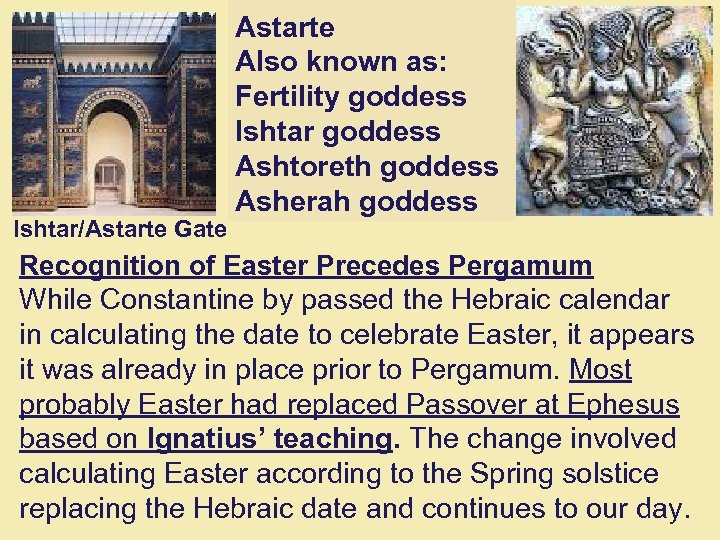Ishtar/Astarte Gate Astarte Also known as: Fertility goddess Ishtar goddess Ashtoreth goddess Asherah goddess Recognition of Easter Precedes Pergamum While Constantine by passed the Hebraic calendar in calculating the date to celebrate Easter, it appears it was already in place prior to Pergamum. Most probably Easter had replaced Passover at Ephesus based on Ignatius’ teaching. The change involved calculating Easter according to the Spring solstice replacing the Hebraic date and continues to our day.