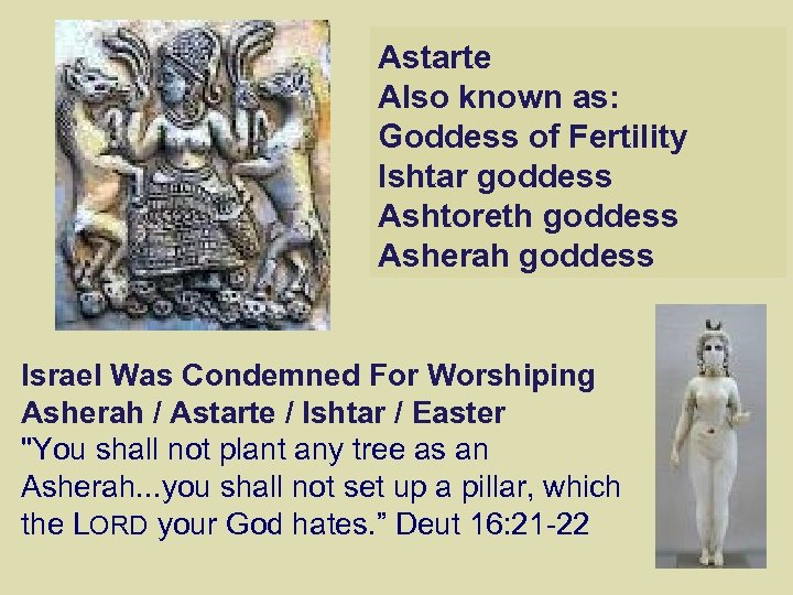 Astarte Also known as: Goddess of Fertility Ishtar goddess Ashtoreth goddess Asherah goddess Israel Was Condemned For Worshiping Asherah / Astarte / Ishtar / Easter "You shall not plant any tree as an Asherah. . . you shall not set up a pillar, which the LORD your God hates. ” Deut 16: 21 -22
