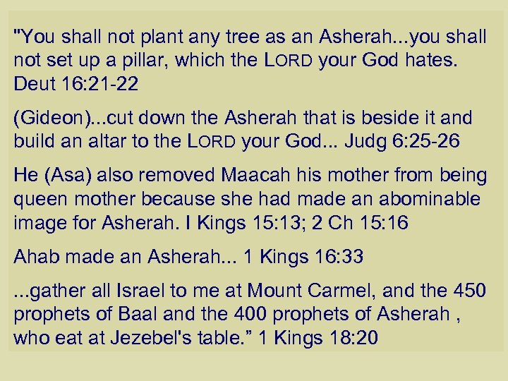 "You shall not plant any tree as an Asherah. . . you shall not set up a pillar, which the LORD your God hates. Deut 16: 21 -22 (Gideon). . . cut down the Asherah that is beside it and build an altar to the LORD your God. . . Judg 6: 25 -26 He (Asa) also removed Maacah his mother from being queen mother because she had made an abominable image for Asherah. I Kings 15: 13; 2 Ch 15: 16 Ahab made an Asherah. . . 1 Kings 16: 33. . . gather all Israel to me at Mount Carmel, and the 450 prophets of Baal and the 400 prophets of Asherah , who eat at Jezebel's table. ” 1 Kings 18: 20