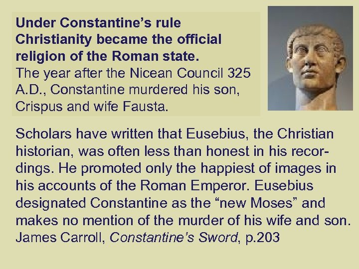 Under Constantine’s rule Christianity became the official religion of the Roman state. The year after the Nicean Council 325 A. D. , Constantine murdered his son, Crispus and wife Fausta. Scholars have written that Eusebius, the Christian historian, was often less than honest in his recordings. He promoted only the happiest of images in his accounts of the Roman Emperor. Eusebius designated Constantine as the “new Moses” and makes no mention of the murder of his wife and son. James Carroll, Constantine’s Sword, p. 203