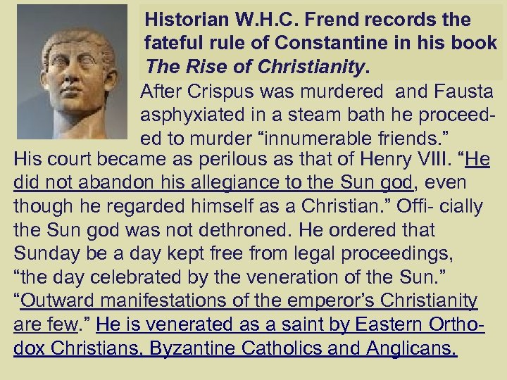 Historian W. H. C. Frend records the fateful rule of Constantine in his book The Rise of Christianity. After Crispus was murdered and Fausta asphyxiated in a steam bath he proceeded to murder “innumerable friends. ” His court became as perilous as that of Henry VIII. “He did not abandon his allegiance to the Sun god, even though he regarded himself as a Christian. ” Offi- cially the Sun god was not dethroned. He ordered that Sunday be a day kept free from legal proceedings, “the day celebrated by the veneration of the Sun. ” “Outward manifestations of the emperor’s Christianity are few. ” He is venerated as a saint by Eastern Orthodox Christians, Byzantine Catholics and Anglicans.
