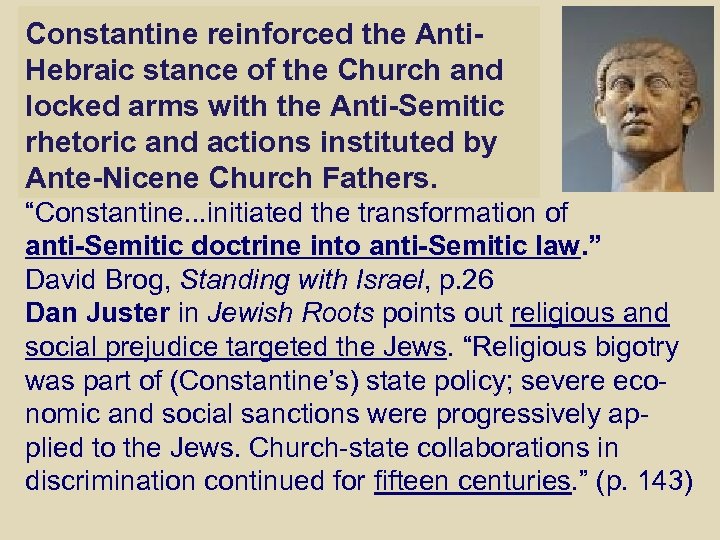 Constantine reinforced the Anti. Hebraic stance of the Church and locked arms with the Anti-Semitic rhetoric and actions instituted by Ante-Nicene Church Fathers. “Constantine. . . initiated the transformation of anti-Semitic doctrine into anti-Semitic law. ” David Brog, Standing with Israel, p. 26 Dan Juster in Jewish Roots points out religious and social prejudice targeted the Jews. “Religious bigotry was part of (Constantine’s) state policy; severe economic and social sanctions were progressively applied to the Jews. Church-state collaborations in discrimination continued for fifteen centuries. ” (p. 143)