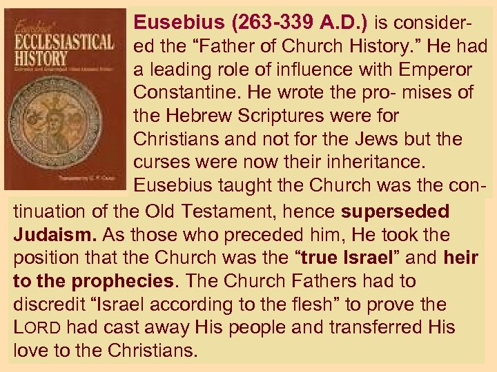 Eusebius (263 -339 A. D. ) is considered the “Father of Church History. ” He had a leading role of influence with Emperor Constantine. He wrote the pro- mises of the Hebrew Scriptures were for Christians and not for the Jews but the curses were now their inheritance. Eusebius taught the Church was the continuation of the Old Testament, hence superseded Judaism. As those who preceded him, He took the position that the Church was the “true Israel” and heir to the prophecies. The Church Fathers had to discredit “Israel according to the flesh” to prove the LORD had cast away His people and transferred His love to the Christians.