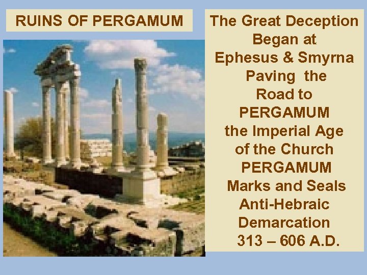 RUINS OF PERGAMUM The Great Deception Began at Ephesus & Smyrna Paving the Road to PERGAMUM the Imperial Age of the Church PERGAMUM Marks and Seals Anti-Hebraic Demarcation 313 – 606 A. D.